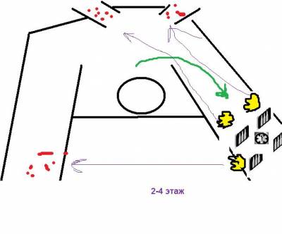 На 2-4 этажах бежим в правый угол от лифта, укрепляемся и отстреливаемся